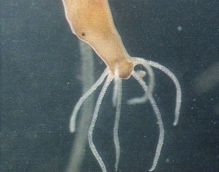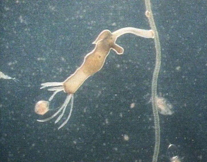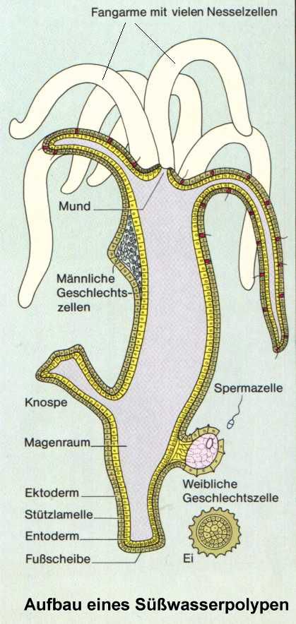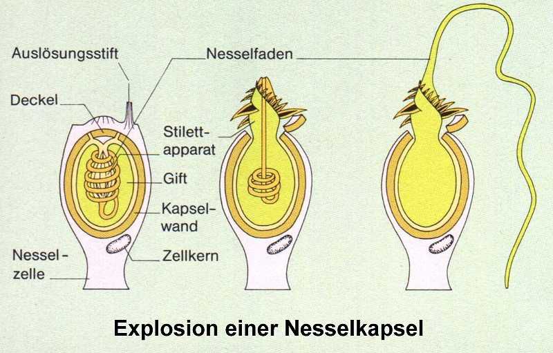 Ein gefährlicher Schussapparat Der Süßwasserpolyp (Hydra sp.) zählt systematisch gesehen als Hohltier ( Coelenterata ) zum Tierstamm der Nesseltiere ( Cnidaria ). Im Süßwasser sind 10 Gattungen mit 16 Arten bekannt, die man in der Regel nur anhand ihrer Nesselkapseln unterscheiden kann. Die bekanntesten sind der Grüne Süßwasserpolyp ( Chlorohydra viridissima ) der Gemeine oder Braune Süßwasserpolyp ( Hydra vulgaris ) und der Graue Süßwasserpolyp ( Hydra oligactis ). Eine Besonderheit ist der Keulenpolyp ( Cordylophora caspia ), der erst vor etwa 150 Jahren aus dem Meer ins Süßwasser einwanderte. Die bis zu drei Zentimeter großen Süßwasserpolypen bevorzugen klares, pflanzenreiches Wasser. Ihr Körper ist durchsichtig, doch gibt ihnen die durchscheinende Nahrung eine unterschiedliche Färbung. So entsteht etwa die grüne Farbe durch einzellige Algen, mit denen der Polyp in Symbiose lebt. Der schlauchförmige Körper des Tieres heftet sich mit einer Fußscheibe am Untergrund fest. Die Mundöffnung am entgegengesetzten Ende ist von sechs oder mehr Tentakeln (Fangarmen) umgeben. Diese enthalten besonders viele Nesselkapseln, die dem Polypen bei der Jagd nach Wasserflöhen, Hüpferlingen, Insektenlarven oder Milben helfen. Jede Nesselkapsel besitzt einen Sensor, den Auslösungsstift ( Cnidocil ), der bei Berührung mit einem Beutetier die Kapsel explodieren lässt. Blitzschnell springt dabei der Deckel auf und der Stilettapparat bohrt sich in die Beute. Obendrein wird der Nesselfaden ausgestülpt und lähmendes Gift in die Beute gepresst. Bei seinem Befreiungskampf löst das Beutetier die Explosion weiterer Nesselzellen aus und beschleunigt so seine eigene Lähmung. Die verbrauchten Nesselzellen werden anschließend wieder durch Ersatzzellen erneuert. Neben diesen Durchschlagkapseln ( Penetranten ) kennt man bei den Polypen auch noch Klebekapseln ( Glutinanten ) und Wickelkapseln ( Volventen ). Die Tentakel umschließen zudem die Beute und transportieren sie durch die Mundöffnung in den Magenraum. |